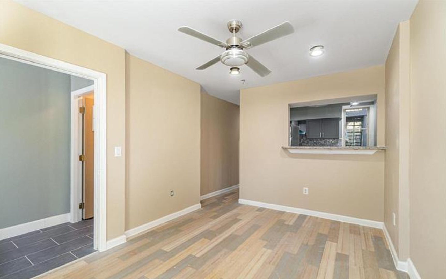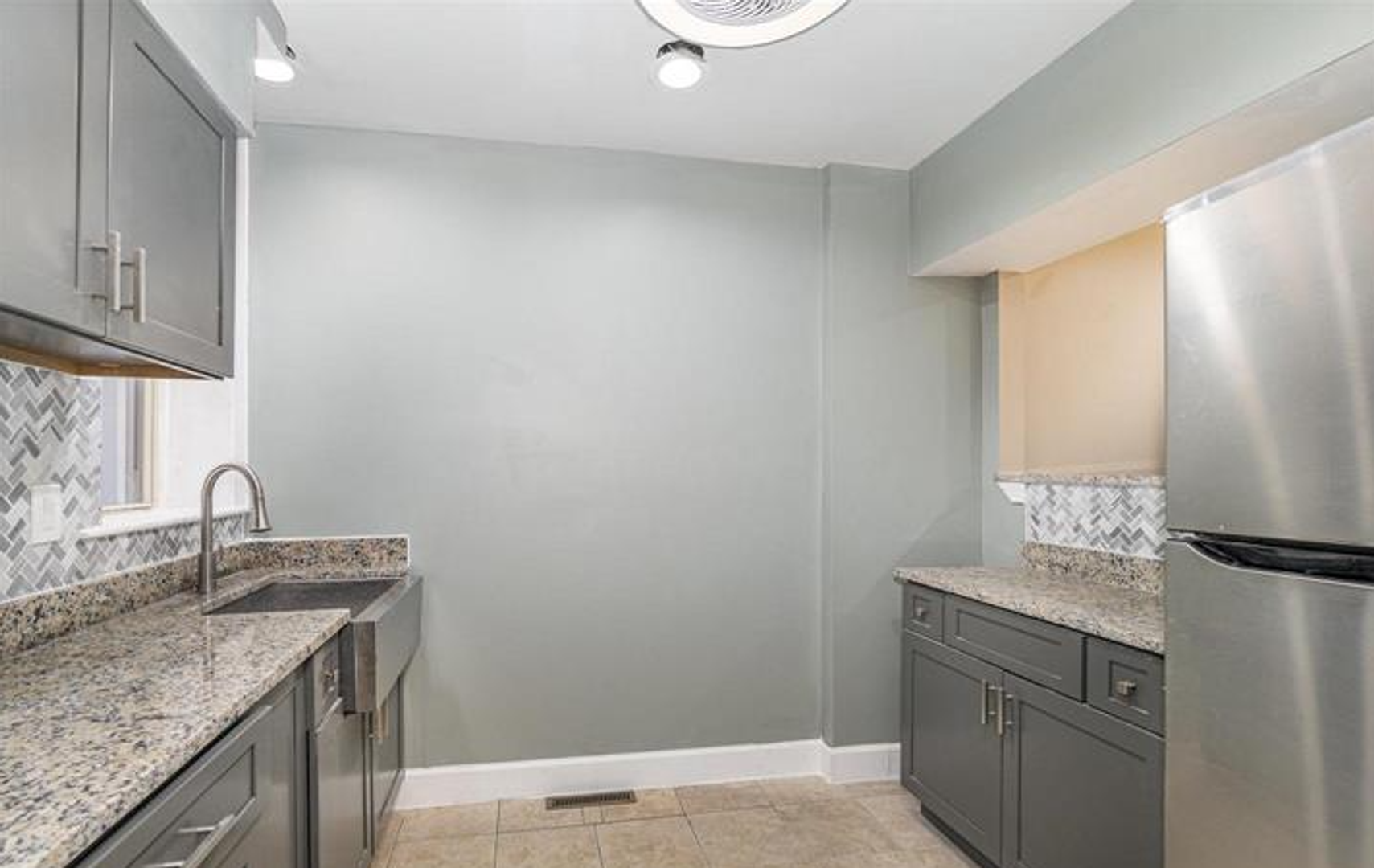 The modern kitchen is both stylish and functional, offering a farmhouse-style sink, recessed lighting, refrigerator, stove, and a convenient breakfast bar that opens to the living and dining area—perfect for casual dining or entertaining.