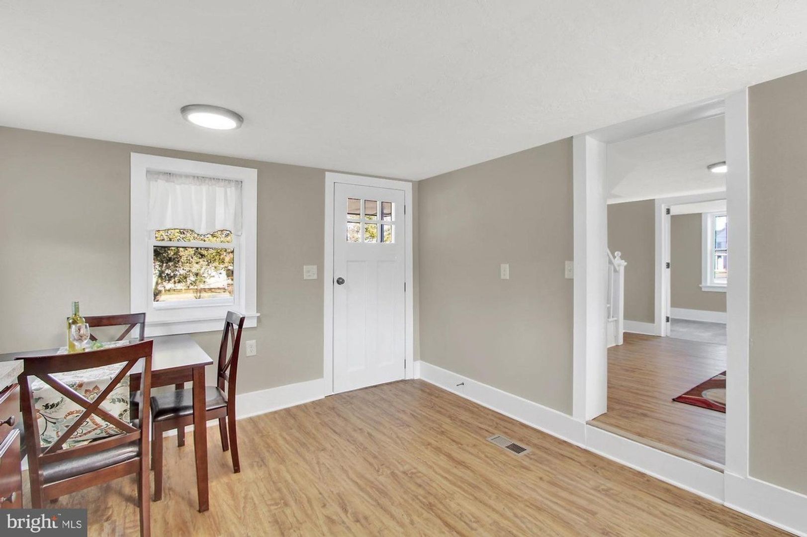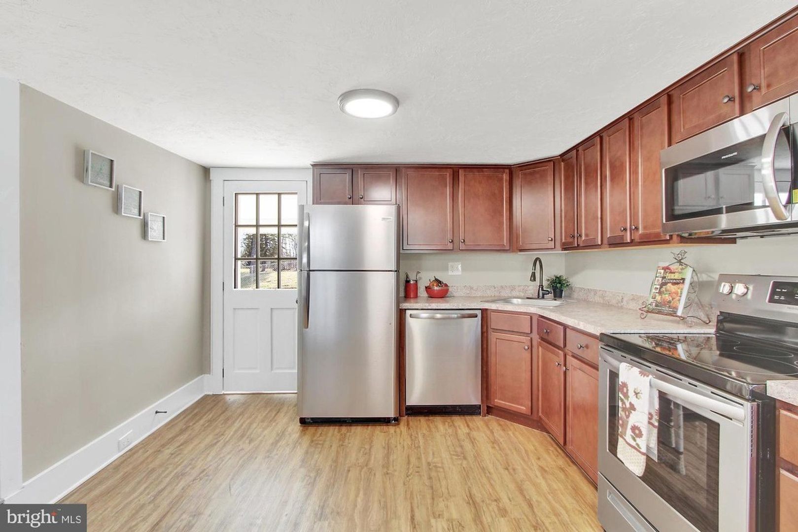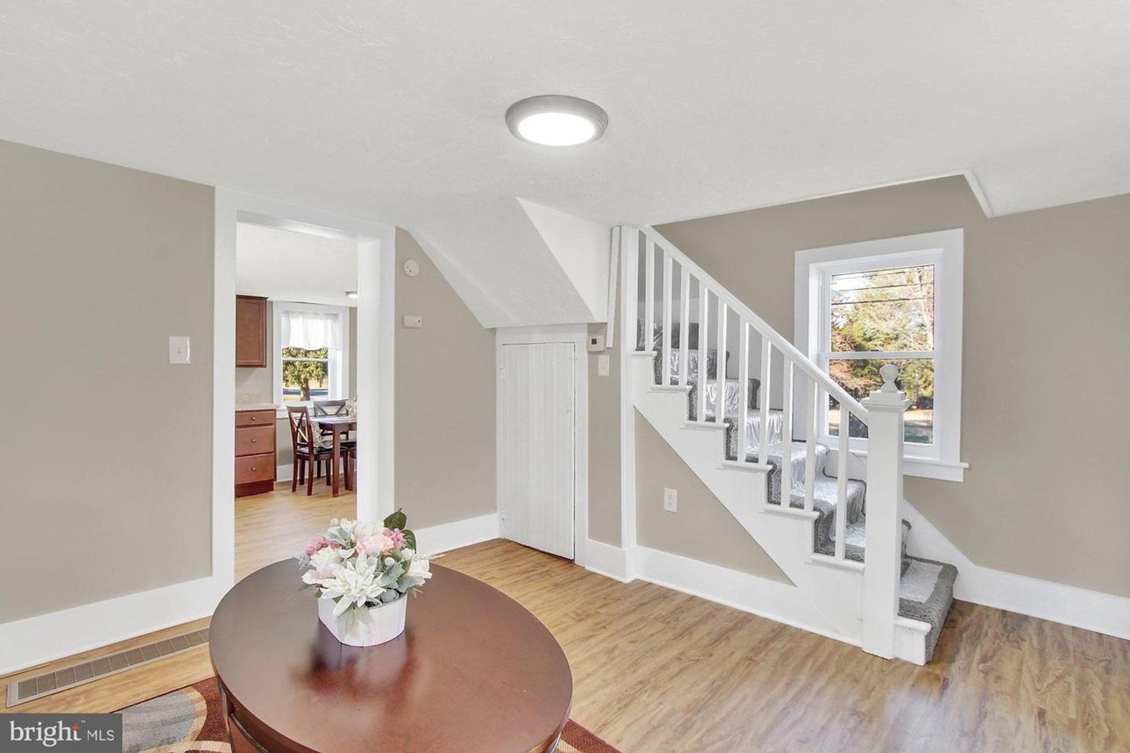 This home offers beautiful solid surface flooring throughout the main living areas and an abundance of natural light that makes the space feel bright and inviting. The spacious kitchen and dining area provides plenty of room to gather, featuring ample cabinet space and equipped with a stove, refrigerator, built-in microwave, and dishwasher for added convenience.