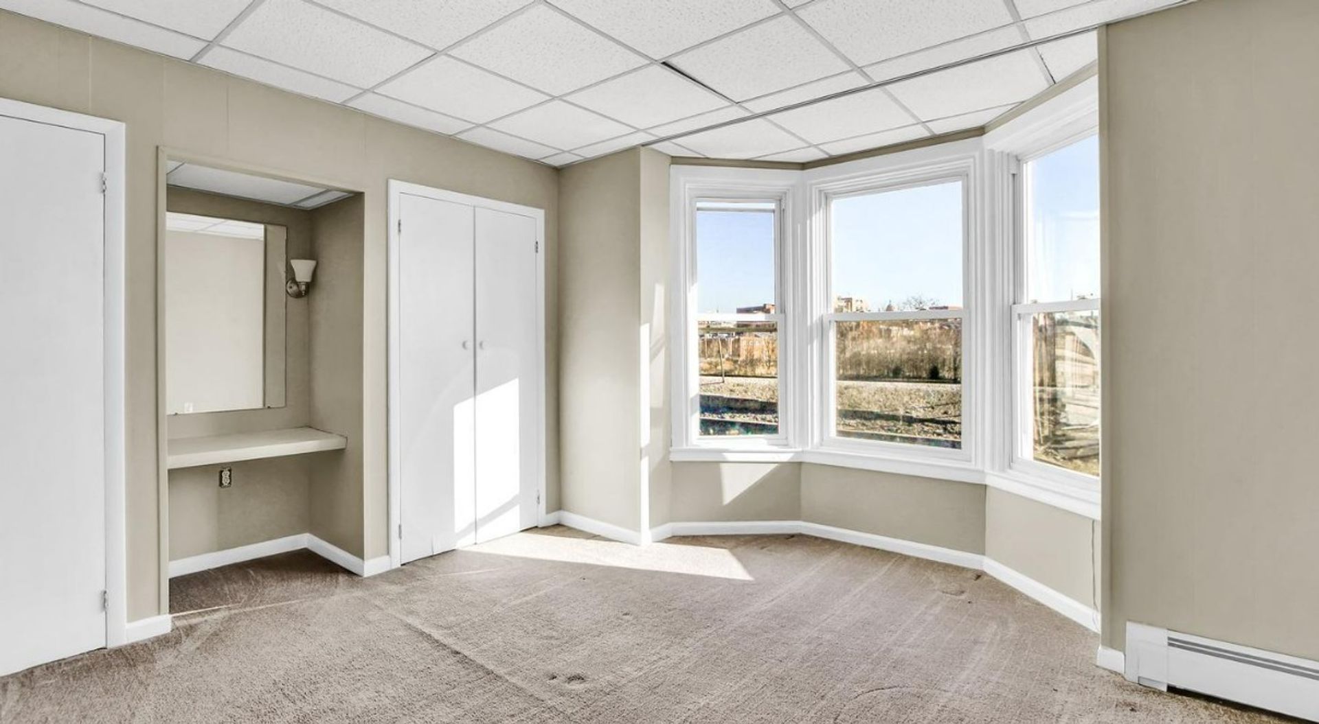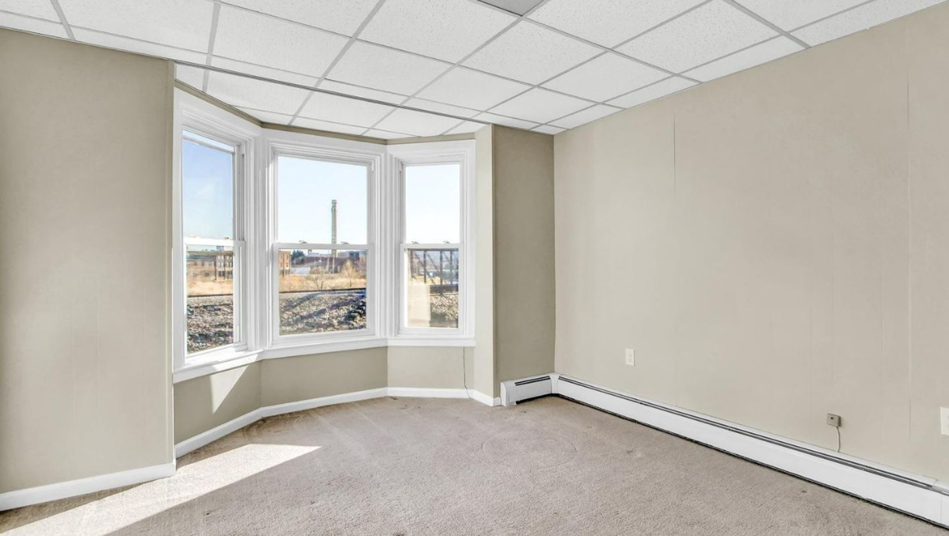 The master bedroom features bay-style windows and a built-in beauty bar, adding a unique touch of charm. A fridge, stove, washer, and dryer are all included for added convenience.