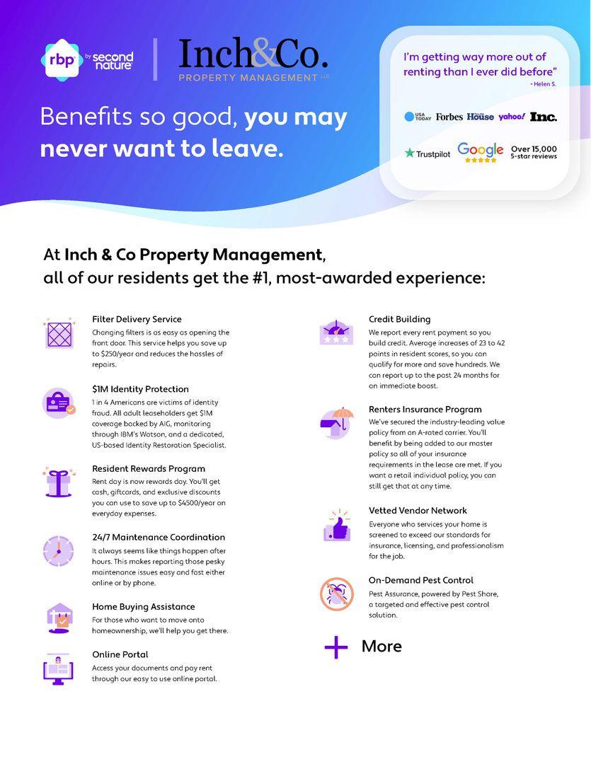 All Inch & Co Property Management residents are enrolled in the Resident Benefits Package (RBP) for $55.00 per month. The Resident Benefit package includes liability insurance, credit building to help boost the resident’s credit score with timely rent payments, up to $1M Identity Theft Protection, HVAC air filter delivery (for applicable properties), our best-in-class resident rewards program, and much more! More details upon application.