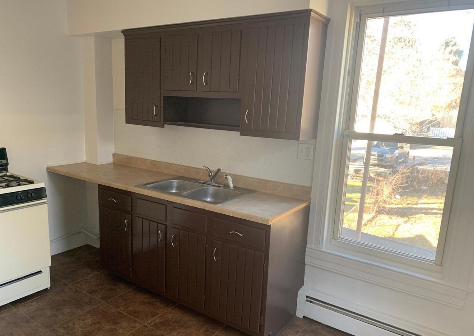 The front living room showcases large bay-style windows, filling the home with sunlight and adding classic charm. The kitchen comes equipped with a stove and refrigerator, offering the essentials for everyday cooking.