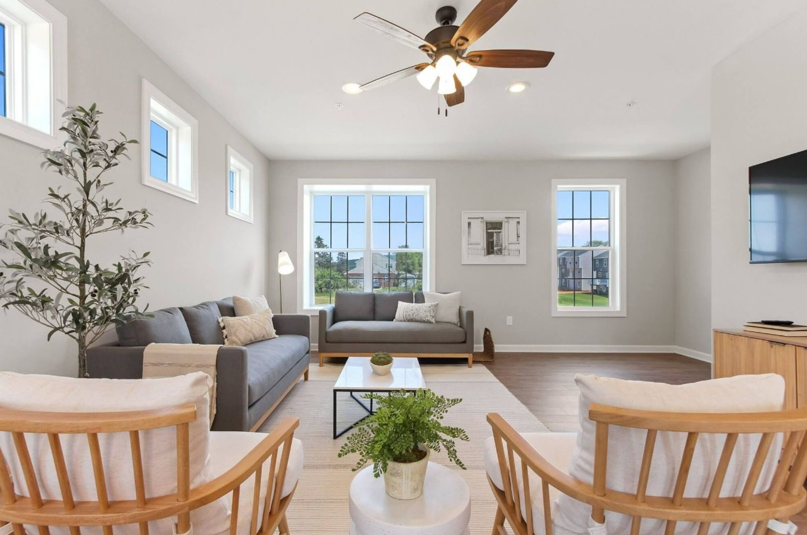 Step inside to an inviting open-concept main level, perfect for entertaining. The chef’s kitchen features white shaker cabinets, granite countertops, stainless steel appliances, a large island, and upgraded lighting. The bright, airy living room includes low-maintenance flooring for effortless style and comfort.