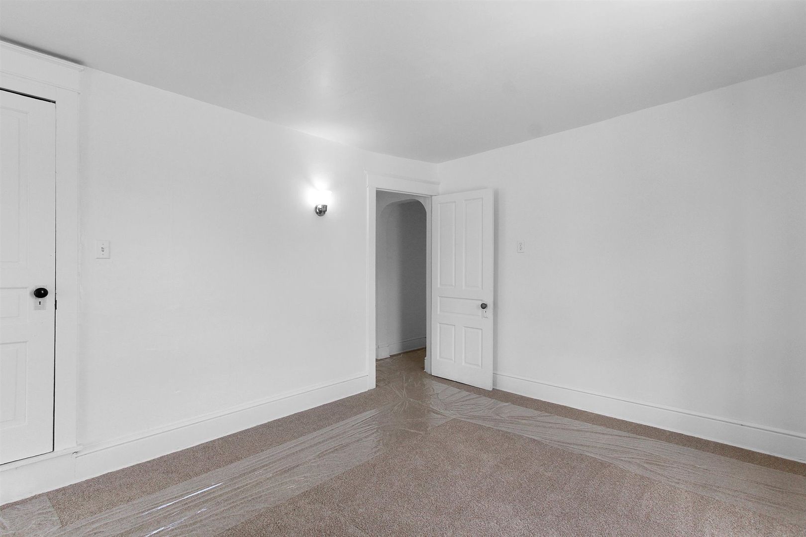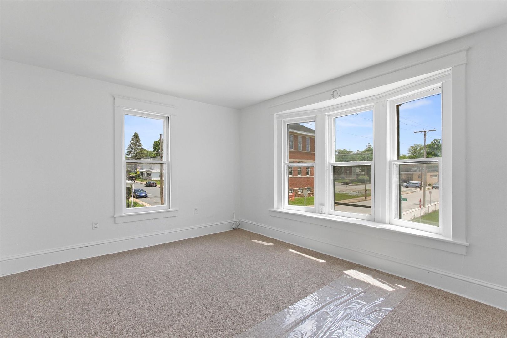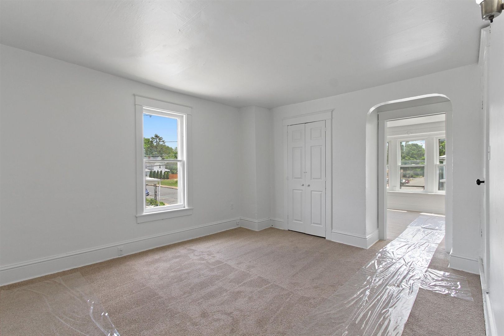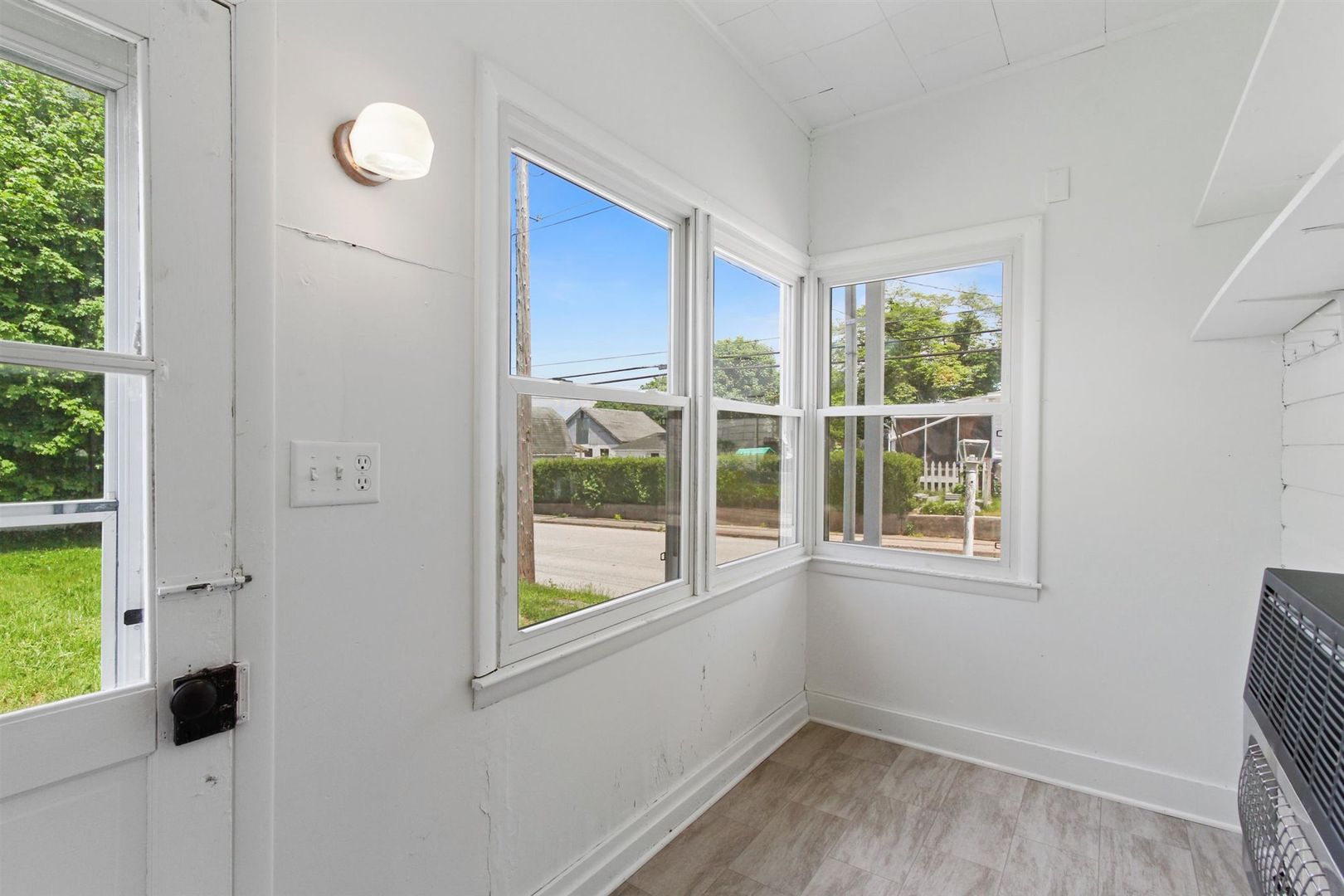 The kitchen offers ample cabinet and counter space, modern lighting, and is equipped with a dishwasher, stove, fridge, and built-in microwave. A cozy sunroom area off the kitchen adds extra space for dining or relaxation. The full bath includes a tub/shower combo, and the spacious master bedroom features a charming bay window.